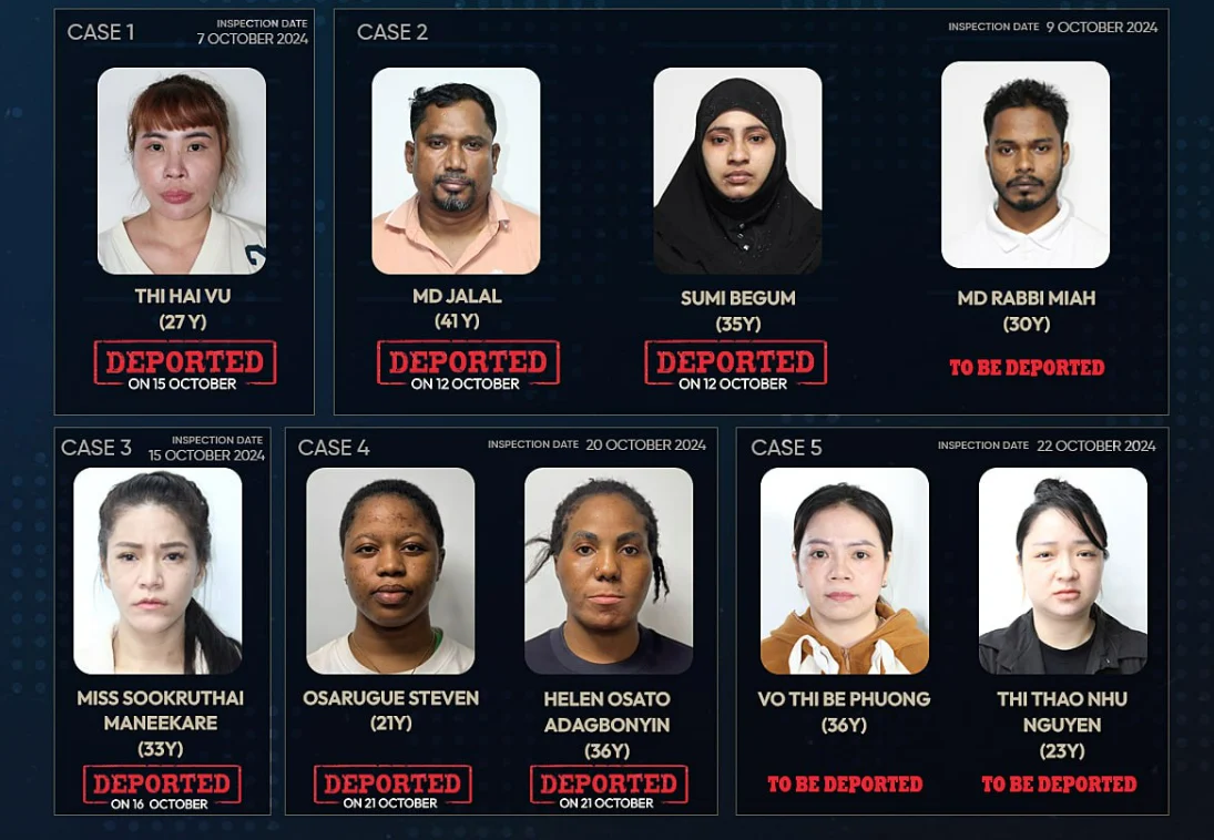 މީގެއިތުރުން، މި މައްސަލަތައް ތަހުޤީޤު ކުރުމަށްފަހު ރާއްޖެ އަނބުރާ ނާދެވޭ ގޮތަށް މީގެތެރެއިން ފަސް އަންހެނަކު އަދި އެއް ފިރިހެނަކު މިހާރު ޑީޕޯޓުކޮށްލާފައިވާ ކަމަށް ވެސް އިމިގްރޭޝަނުން ބުނެފައިވެއެވެ. އަދި އަނެއް ތިން ބިދޭސީން ޑީޕޯޓުކުރުމުގެ މަސައްކަތް މިހާރު ކުރަމުންދާ ކަމަށްވެސް ބުނެފައިވެއެވެ.